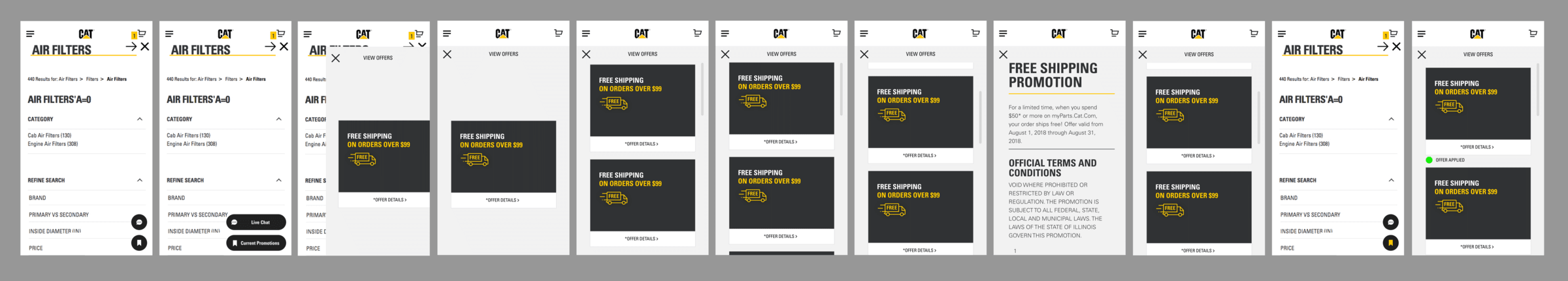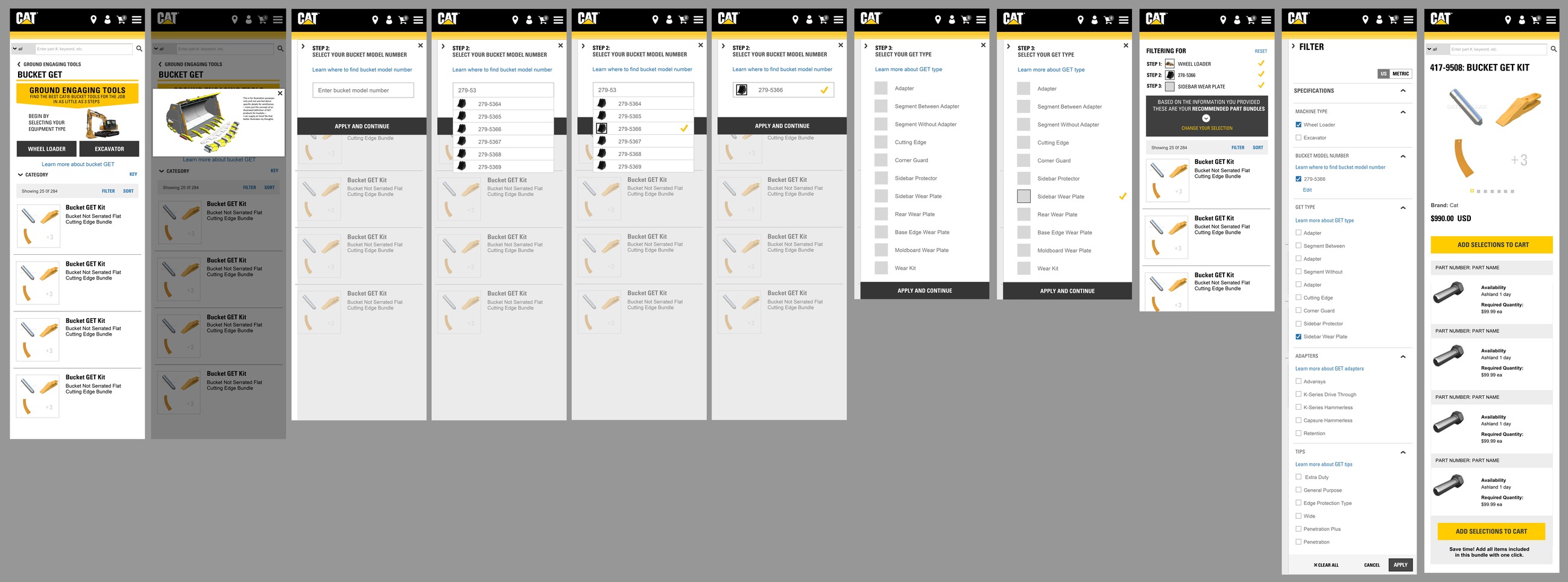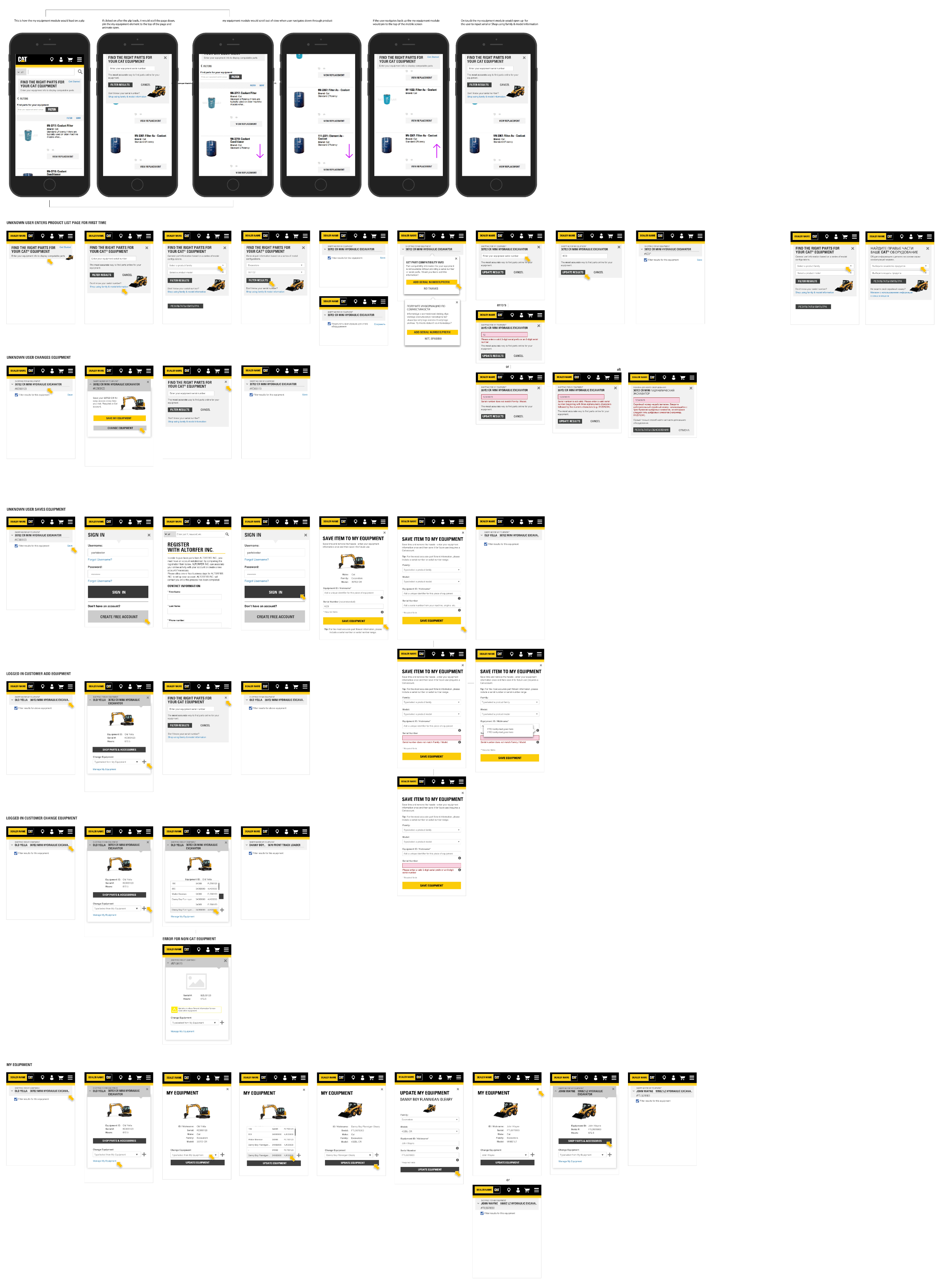 parts.cat.com mobile flow for adding equipment and viewing fitment information for unknown user, logged in customer and equipment management.