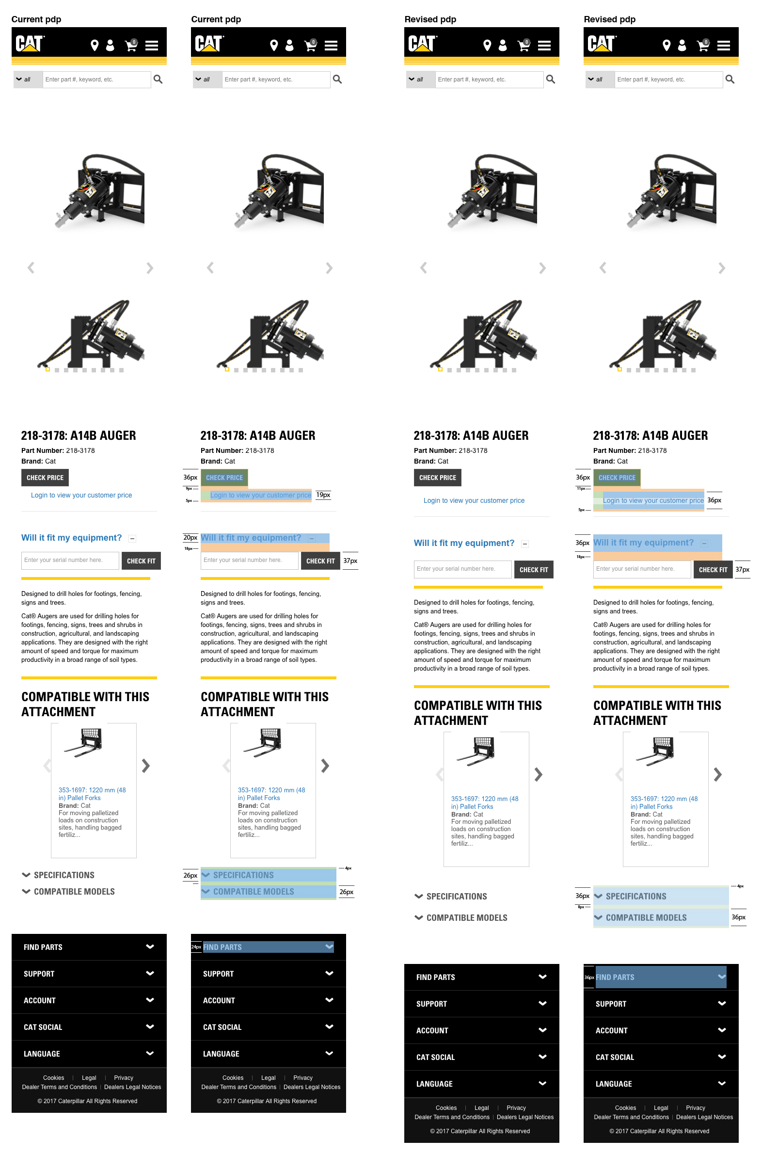 Defining hit area on parts.cat.com current vs desired mobile pages